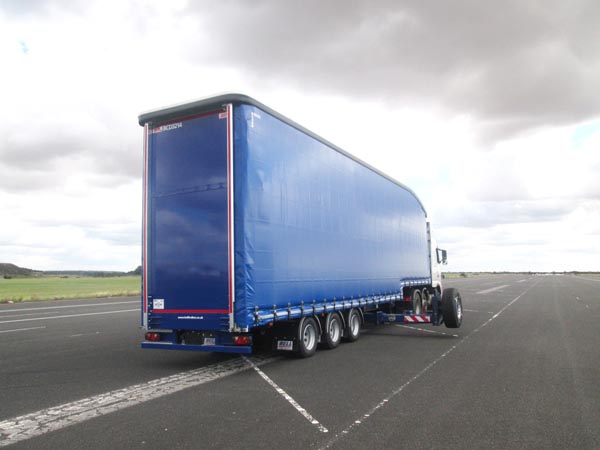 The third trailer to be assessed – the SDC Fastliner, comprises a straight frame curtainsider fitted with a sliding concertina aluminium plank system attached to the curtain. The system runs in the standard SDC roof rail with steel tracks attached to the side rave. The smart design from SDC eliminates the need for side posts giving a clear side aperture for loading. The concertina planks are fitted with slots/holes designed for the fitment of double decking beams or straps for roll cage retention. From the outside SDC’s Fastliner trailer resembles their standard curtainsider, however the aluminium planks provide customers with additional load security during transit. The Fastliner trailer was tested to a 29,000kg payload – 2,000kg more than the standard continental trailer certification of 27,000kg.