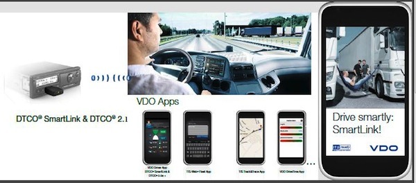 Apps_VisualSmartphones make daily lives easier for all. VDO have added in an array of apps designed to work in conjunction with the Digital Tachograph turning your Smartphone into a remote control for Truck Drivers and a communicating and mapping tool for Fleet Managers back in the Transport Office. The DTCO SmartLink can make a versatile software solution for making daily driving more efficient and comfortable for the Driver by allowing the Driver to view the Digital Tachograph data on his Smartphone. The VDO Driver App displays menus and buttons on the smart phones screen, and shows the VDO counter data, Driving and rest times Plus the Driver’s cards data in real time. What could be easier!